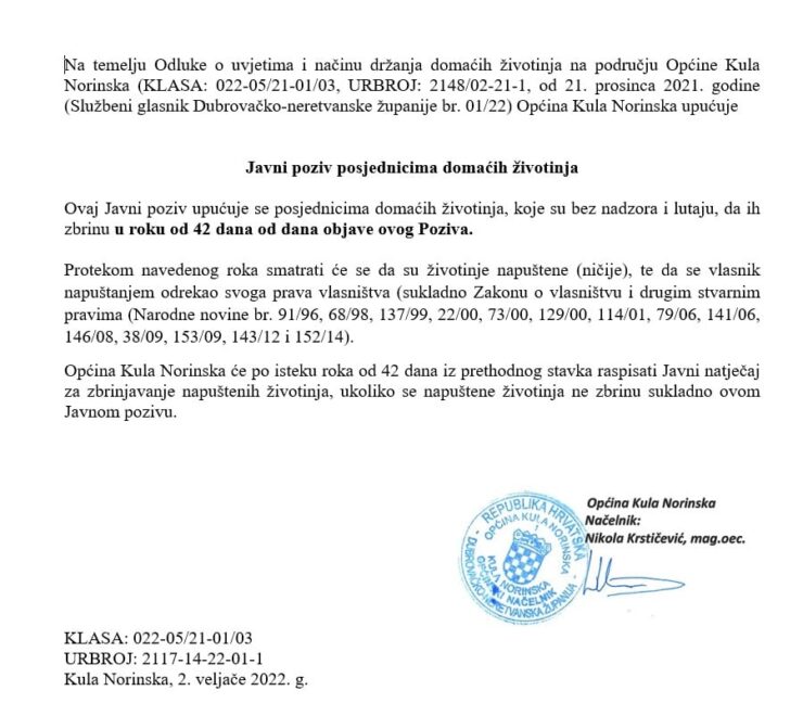 Općina Kula Norinska uputila je Javni poziv posjednicima domaćih životinja, koji se odnosi prema životinjama bez nadzora i lutaju.