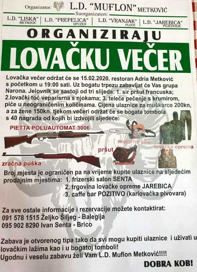 Lovačko društvo Muflon Metković organizira Lovačku večer koja će se održati u subotu, 15. veljače, u restoranu Adria Metković, s početkom u 19 sati.
