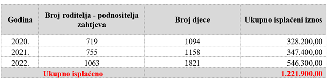 Prošle godine je iz gradskoga proračuna, za 1.158 djece, na račune 755 roditelja, isplaćeno je 347.400,00 kuna, dok je 2020. godine za 1.094 djece, na račune 719 roditelja, isplaćeno ukupno 328.200,00 kuna.
