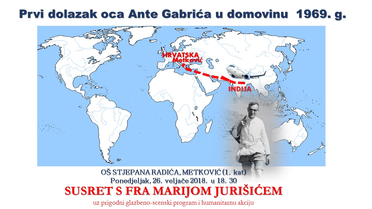 S obzirom na ovogodišnju temu Pet dolazaka oca Ante Gabrića u domovinu, naša škola posebno svečano obilježava prvi dolazak 1969. godine. Tim povodom u školi (na 1. katu) u ponedjeljak 26. veljače 2018., s početkom u 18.30 organiziramo Susret sa fra Marijom Jurušićem, nekadašnjim župnikom Župe sv. Ilije koji će nam održati predavanje i posvjedočiti o događanjima susreta s ocem Antom koji je nakon 31 godinu, koliko je bilo prošlo nakon njegovog dolaska u Indiju, prvi put posjetio Metković.