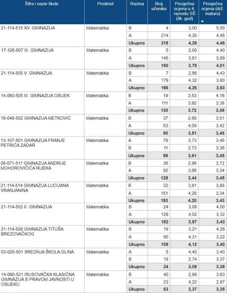 U tablici u nastavku Srednja.hr je izdvojila deset najboljih prosječnih ocjena na maturi iz Matematike, s tim da je na popisu 12 škola jer su neke ostvarile istu prosječnu ocjenu.