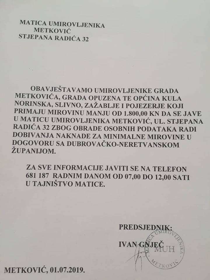OBAVIJEST ZA UMIROVLJENIKE