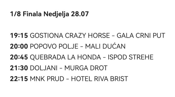 Nestvarna je gol razlika koju su napravili Dalmata Hangover i Crni put pekarstvo Metkovka u svojim skupinama. Ne može se reći da su igrali skupine smrti poput ekipa Gostione Crazy Horse i Ispod strehe CB Zona, ali su svakako svojim igrama pokazali da neće štediti nikoga. Gore navedene Gostiona i Ispod strehe su se dosta potrošili u svojoj skupini i oni su već pretrpjeli sitne udarce Neretvanskog futsala, ali su pokazali žilavost i vrijedi ih zbog toga istaknuti među one najopasnije. Fotostudio Primus je grupu s Doljanima i Pravom stranom završio neokrznut kao najbolji i otišao direktno u 1/4 finale i to valjda dovoljno govori o njima, oni ulaze u knockoout bez Marina Talajića pa će bit zanimljivo vidit kako će to izgledat. Mnk Prud i Hotel Rivu Brist kuglice su ponovno povezale pa ćemo već sutra gledati revanš te napete utakmice gdje mladi Pločani sigurno žele poravnati račune. Popovo polje i Mali dućan bit ce najmlađa utakmica 1/8 finala, očekujemo puno trke i agresivnosti, status favorita ipak ima Popovo polje zbog pokazanog u grupi, ali to je samo ono na papiru, Krvavčani znaju namirisat krv. Gala Crni put, Murga Drot, Doljani, Quebrada la honda, ekipe koje smo stavili u istu koš jer su pokazali promjenjivu formu tijekom grupne faze. Malo gore, pa malo dole, nešto kao sunčano s promjenjivom naoblakom s mogučnošću pljuska. To može bit njihova prednost jer ne znate kome stajete na put i bit će zanimljiva njihova reakcija u 1/8 finala, sve te ekipe imaju ozbiljne pojedince u svojim ekipama koje bi mnogi rado izbjegli.