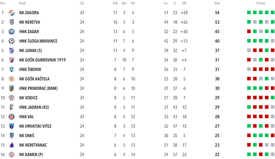 Situacija na vrhu ljestvice iznimno je napeta. Zagora trenutno drži prvo mjesto s 54 boda, dok Neretva zaostaje tek jedan bod, uz 53 osvojena boda. U ovom kolu Zagora gostuje kod Zadra na Stanovima, što dodatno otvara mogućnost da se Metkovci eventualnom pobjedom vrate na sam vrh.